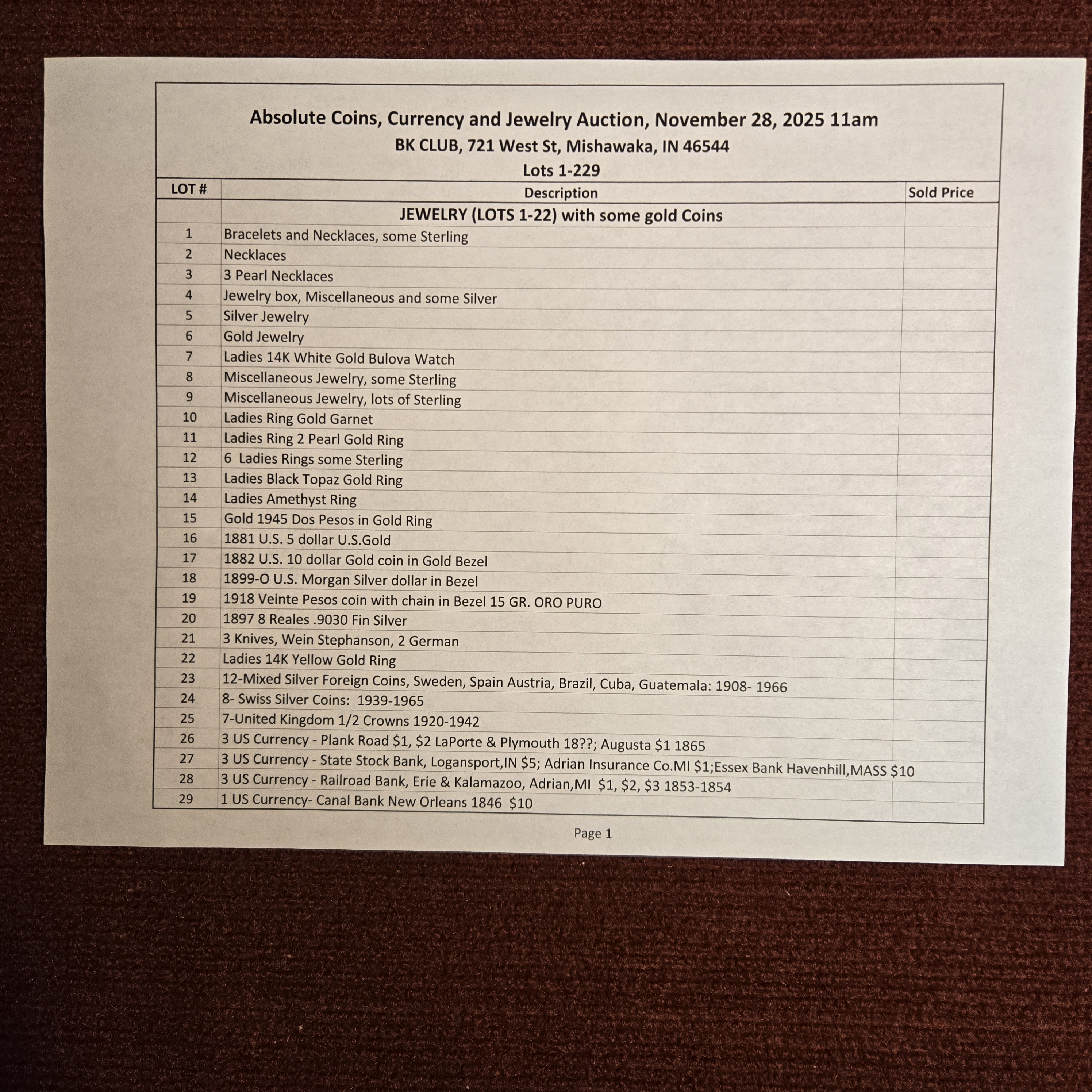 Catalog In Photo Section. Photos Lots 81-160 in this Ad, See Other Two Ads for remaining Photo Lots!!!! ABSOLUTE COIN & JEWELRY AUCTION- LIVE ONLY-229 LOTS Large Estate Coin Collection and Jewelry will be sold: FRIDAY, NOVEMBER 28, 2025, 11am(est) AT:721 S. West St, Mishawaka, IN 46544 Doors open at 9:30 AM Located on the corner of 9th and West St. BK Club Hall. West of Main St. Watch for signs. COINS: 1881, 1907 & 1912 Five Dollar, 1882 Ten Dollar, 1907 & 1906 2.5 Dollar and 1918 20 Peso Gold Coins; 33+ Morgan Silver Dollars; 1857 Flying Eagle; Silver Peace Dollars; Silver Half Dollars including Walking Liberty, Franklin and Kennedy; Barber, Liberty and Washington Silver Quarters; Barber, Mercury and Roosevelt Silver Dimes; Buffalo, Liberty “V”, and Jefferson Nickels; Indian Head Penny; Unsorted Wheat Pennies; Medallions; Tokens and lots more!! WORLD COINS, CURRENCY & MISC: Railroad Bank Adrian MI, Plank Road LaPorte,IN and More Currency 1840-1860, Mexican Currency 1-20 Peso 1913-1915, US Silver Cert, Star and Bank Notes.; Several Bags of Silver US and Foreign Coins un-sorted; GOLD & SILVER JEWELRY; Over 100 Casino Slot Token Collection; Over 70 Trolley/Bus Token Collection; Early to Mid 1800's U.S. Tokens; Reference Books and Lots more!! COIN TERMS: CASH ONLY ON COINS AND JEWELRY! State issued photo ID needed to register. Statements made day of auction take precedence over printed matter. OWNER: Estate of Joe J. Miller NOTE: We have only started to sort and organize this collection and yet to discover the total quantity. There will be over 250 lots and many Coins are PROOF-XF-AU-UNC. Please refer to the Auction-Info.Com website for auction photos and full catalog listing. This will be an interesting auction you won’t want to miss!!!! Goodrich Inc, DBA GOODRICH AUCTION COMPANY 421 LINCOLNWAY WEST MISHAWAKA, IN 46544 OFFICE: 574-255-2556 DAVID W. GOODRICH, AUCTIONEER IN LIC NO.: AU01040401 Email: davidwgoodrich@cs.com Scott Campbell Auctioneer, IN Lic No.: AU12300008